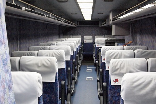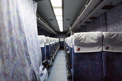 車内は3列シート仕様から広福ライナー夜行便運行のために4列シート仕様(11列)へと改造されています。 運転席側の前から2列(カーテンがかかってる部分)は乗務員用の仮眠室になっています。(エアロエースの方は床下に仮眠室の設置があります。)