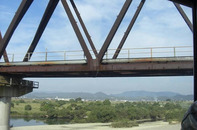 高梁川沿いの少し狭い土手沿いの道路を走るバス。