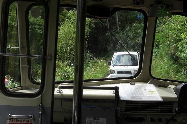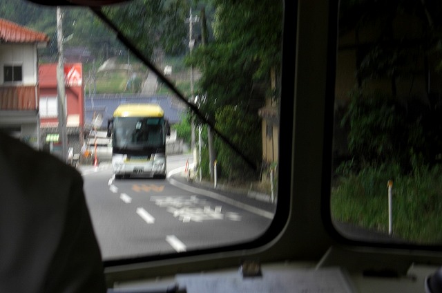 対向車が現れたがバスがバックすることに・・・。