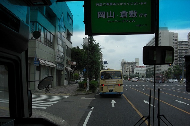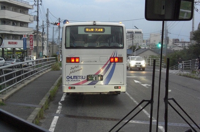 岡山商大の近くで中鉄北部バスのブルーリボンシティ(セレガマスク)の後ろにつく。岡山商大前でも1名下車がありました。