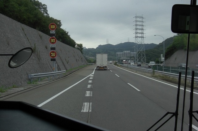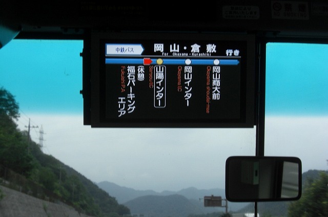 山陽インターバス停でも下車があり、写真は一気に岡山インターの手前です。前の下電観光バスのセレガは福山ナンバー登録でした。福山ナンバーの下電観光バス撮りたい・・・。