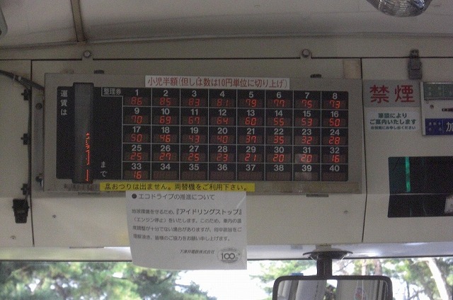 見にくいですが運賃表はこのような感じです。児島駅発の便ですが倉敷駅からの運賃も表示されていました。
