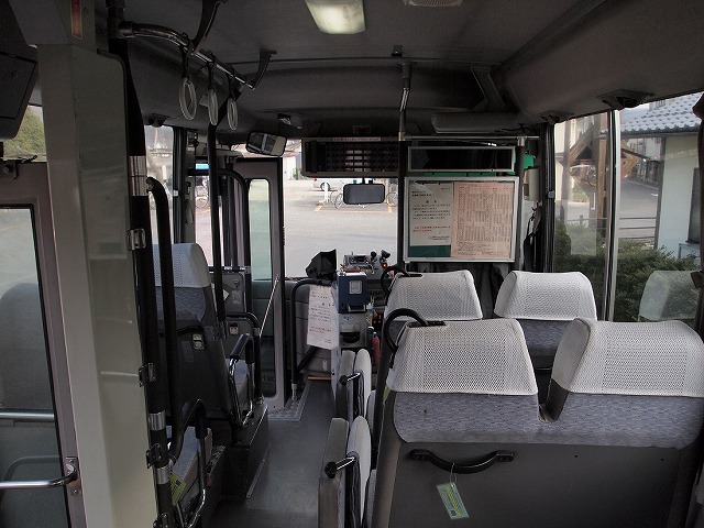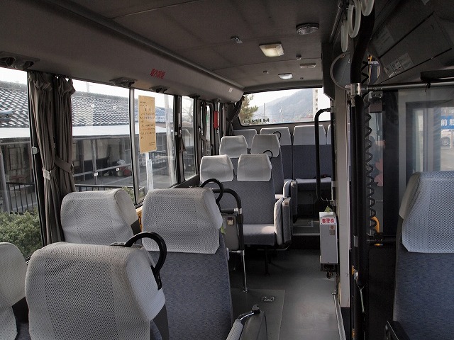 車内は2人掛けと1人掛けの配列が並んでおり、中央部は横向きシートになってます。前向きシートは補助席にシートベルトの設置が確認できました。