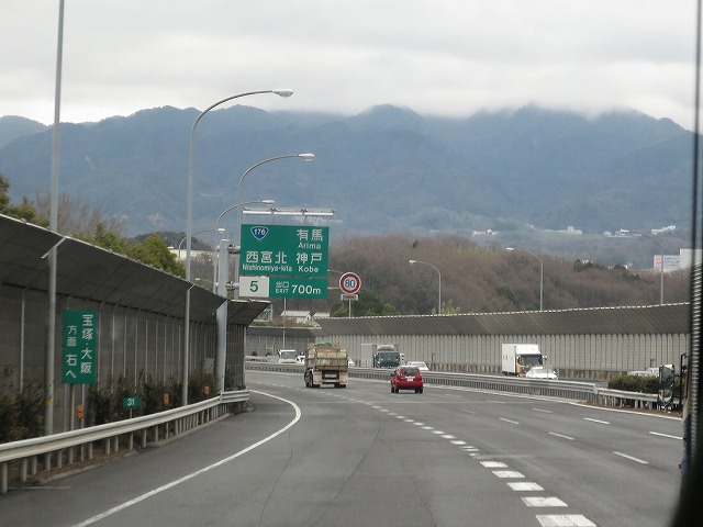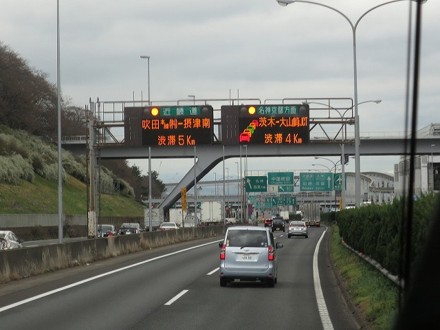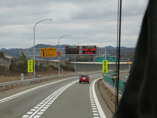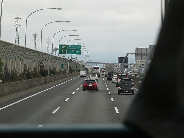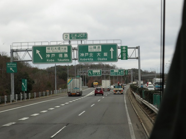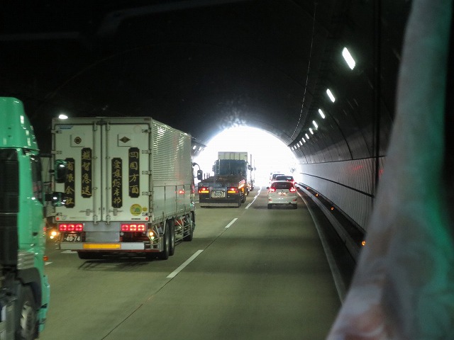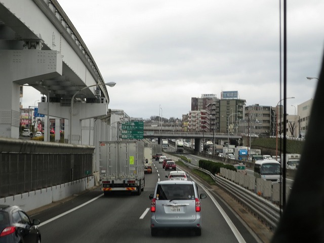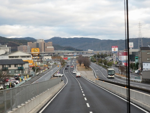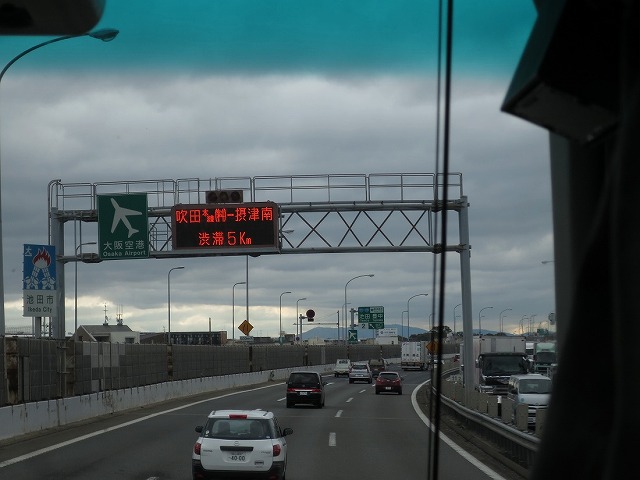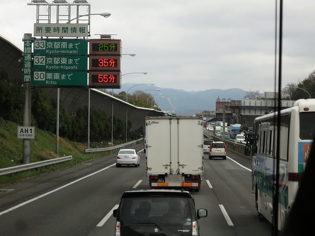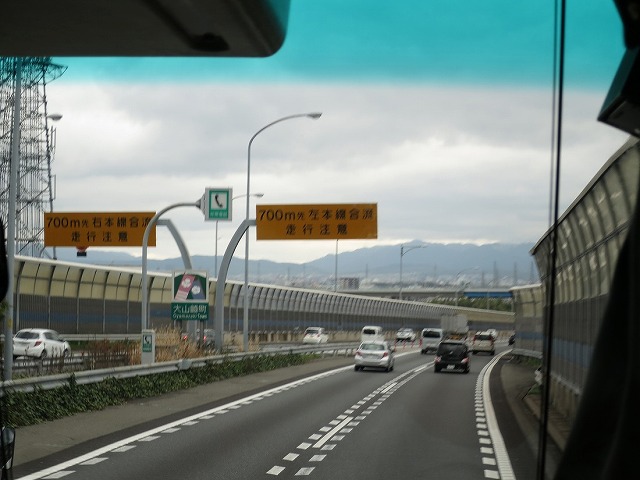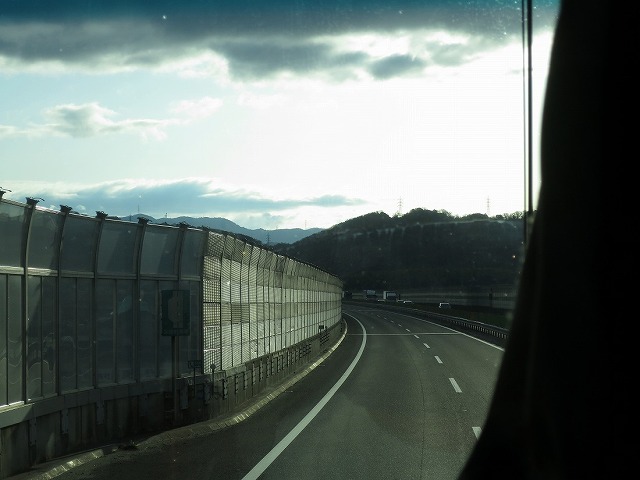 吹田ジャンクションから名神高速を走ります。右隣には徳島バスの京都行の高速バスが走ってました。