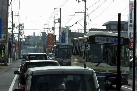 西深津町の近くを走るバス。左側に写ってるトラックもエロい物件ですね!? トヨタ・ダイナかな?奈良津バス停付近。信号待ちの渋滞です。