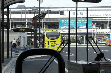 奈良津の交差点を左折した後は福山市内へと向けて、南下します。途中中国バスと井笠鉄道の車両とスライド。三吉町で1名乗せて、三吉町南1丁目交差点を右折。中国バスのエルガLTとスライド。福山駅に近いってこともあり、交通量も多いです。以前は天満屋の横で下車が可能だったようですが、現在は綺麗なバスターミナルが出来ているので↓右折しバスターミナルへと入り、終点の福山駅に到着です。