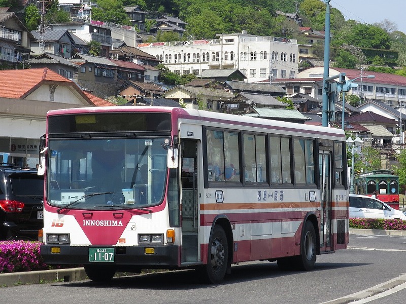 見にくいですが因の島運輸のエルガミオとスライド。因島島内路線で使用してる模様。
