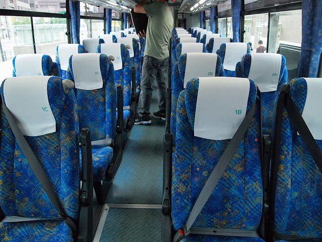 車内は4列シートが並んでおり、後部にはこのバス自慢!?の設備、パウダールーム(化粧室とトイレ)の設置もあります。サービスコーナーもついてる模様。