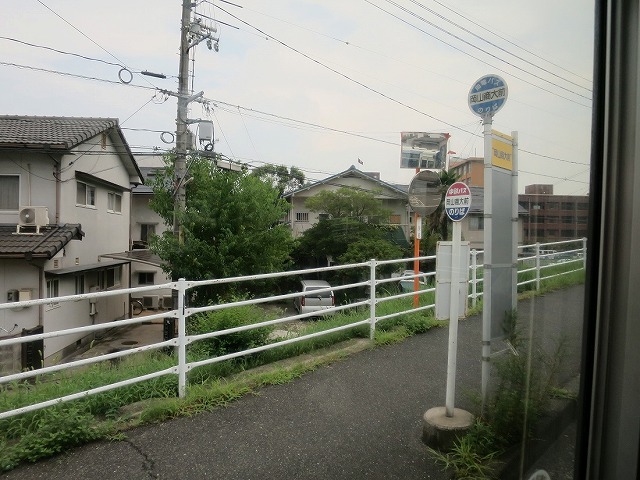 岡山商大前。ここの位置の岡山商大前バス停は岡電バスの岡山駅~中央病院~津高営業所線、中鉄バスの天満屋~岡山駅~三門~国立病院線の2路線のみ停車します。
