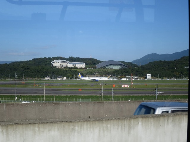 福岡空港の前を走る。スカイマークの飛行機が見えました。