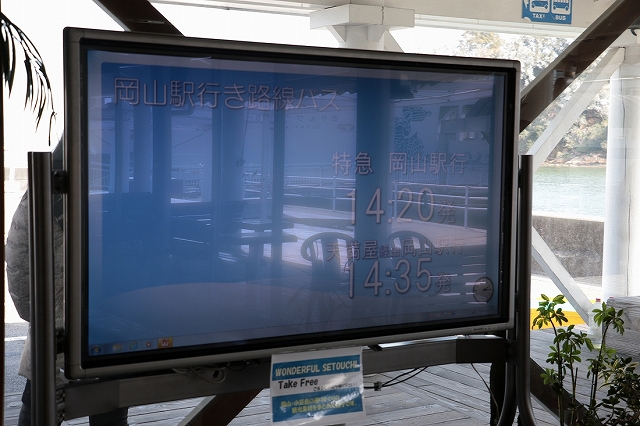 見にくいですがフェリーターミナルにはパワーポイントで作った次に来るバスの時刻表示がありました。