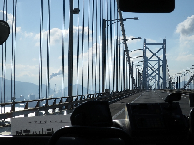 瀬戸大橋を渡る。晴れてて眺めがよかったです。途中四国から広島や岡山へ向かう高速バスも見かけます。