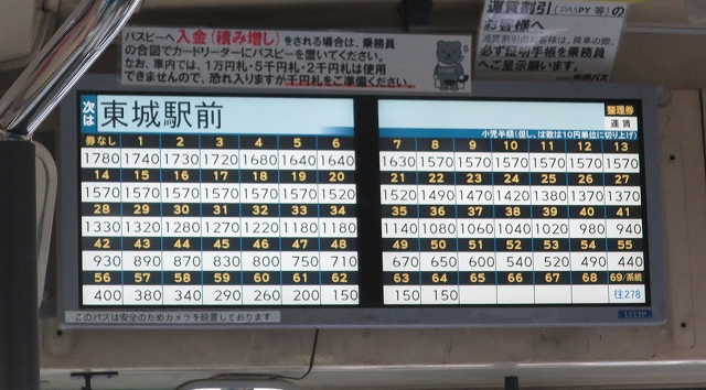 東城駅までの運賃表。遠いところに来たなと実感。